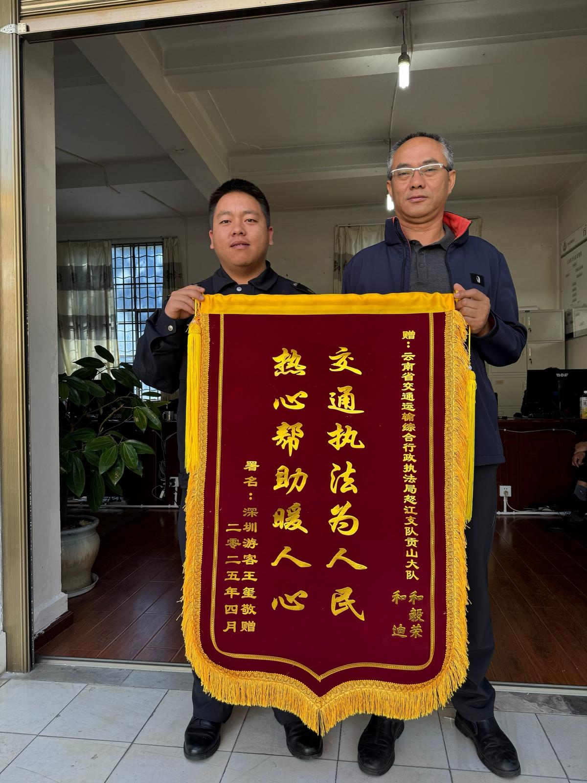 一面锦旗,承载着群众真挚的感激;一次援手,彰显着执法为民的初心。2025年4月17日,省交通执法局怒江支队贡山大队收到来自深圳游客王玺赠送的一面印有“交通执法为人民 热心帮助暖人心”字样的锦旗,这份跨越千里的谢意,成为对执法人员坚守一线、服务群众的生动褒奖。