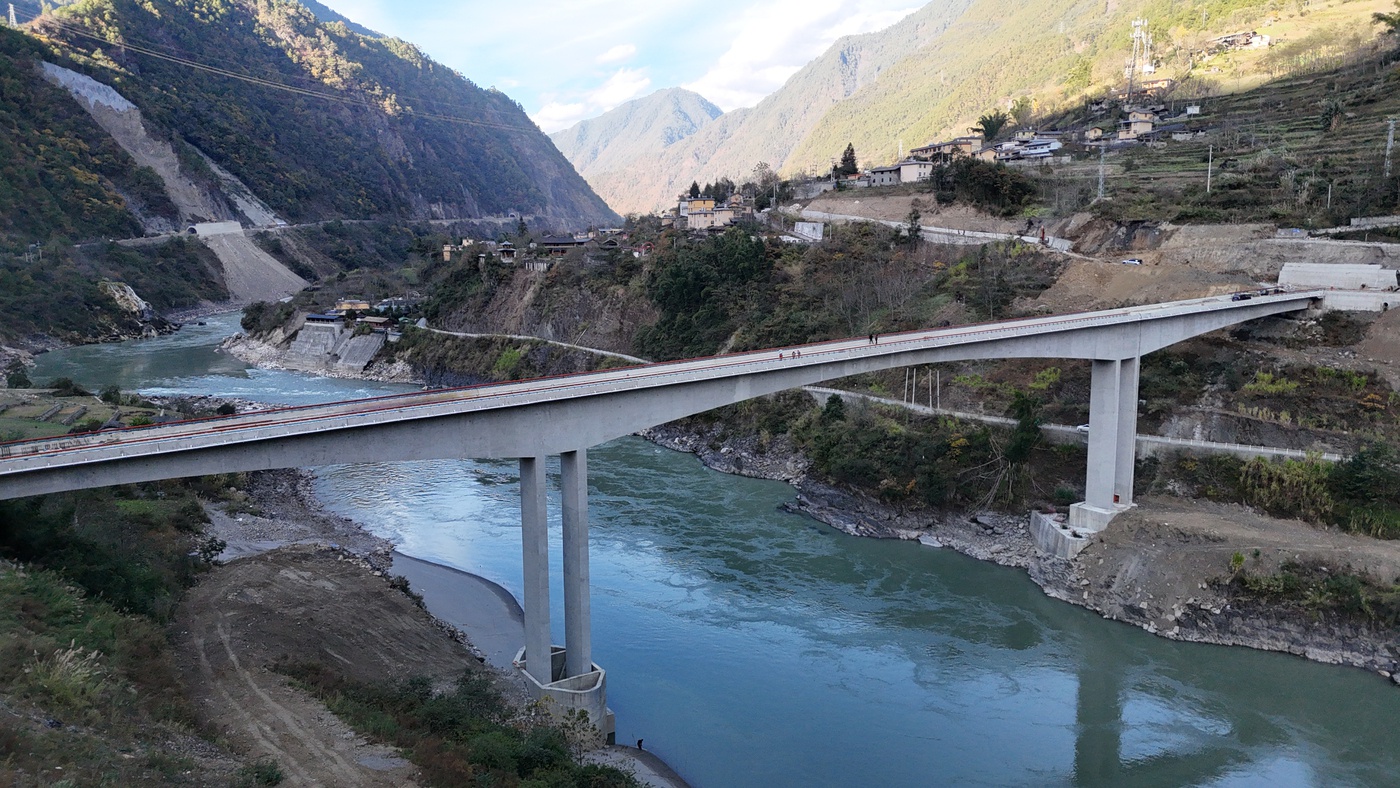 作为连接怒江西岸美丽公路与怒江东岸永迪公路的关键枢纽,中交永拉嘎大桥由中交集团援建,全长244.04米、宽9米,采用62.5米+115米+62.5米预应力混凝土连续刚构桥结构,以设计施工总承包(EPC)模式推进,合同额达3573.6957万元。大桥东接永拉嘎村、西连马西当村,距离捧当乡政府8公里、县城12公里,其主体工程已于今年4月顺利完工,目前正全力推进引道清理、桥面附属设施等收尾工作。