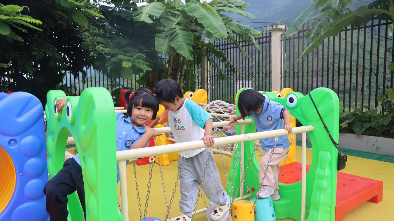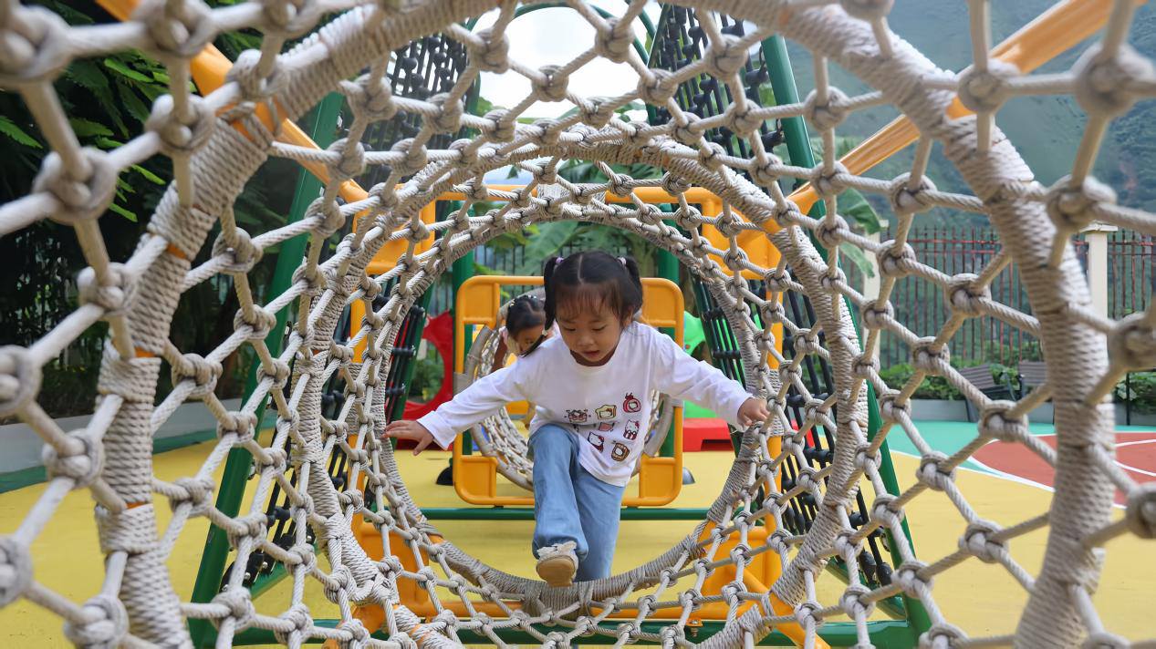 孩子们正在全新的多功能体育器材上玩耍。和倩/摄