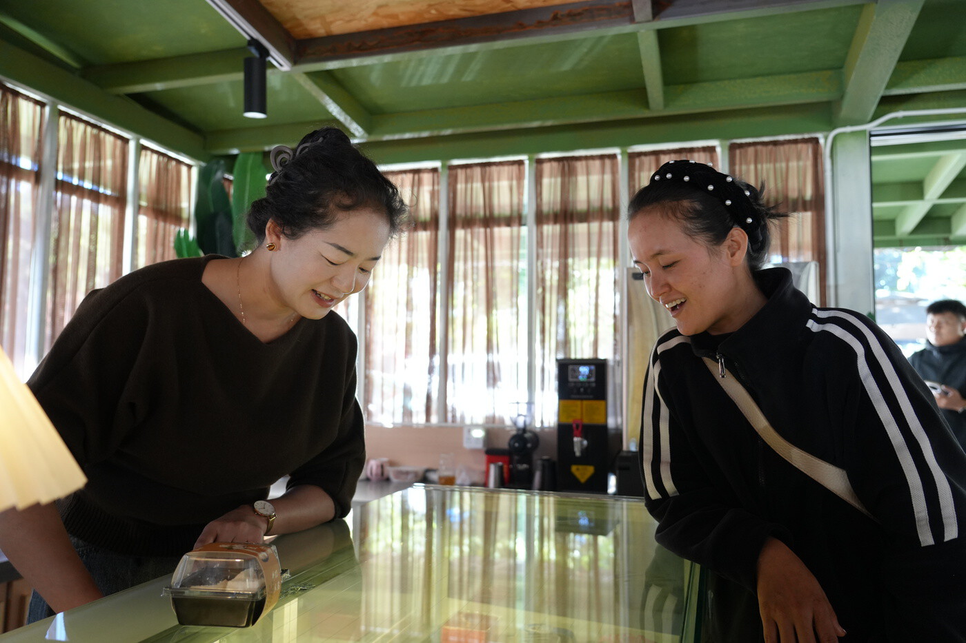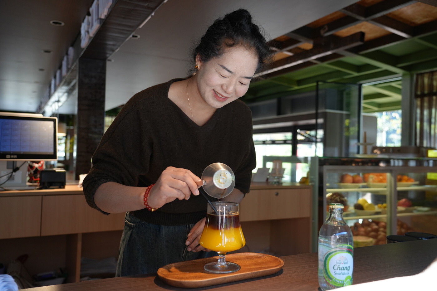 “这是产自我们怒江本地的卡蒂姆咖啡,生长在海拔1100米至1500米的火山灰土壤里,带有红酒的香气和热带水果的风味,喝起来甜感比较明显。”胡玉兰一边为顾客递上咖啡,一边熟练地介绍着,眼神里满是自信与从容。谁能想到,这位如今管理5家咖啡店的店长,三年前还是穿梭在怒江两岸的“卖茶姑娘”。