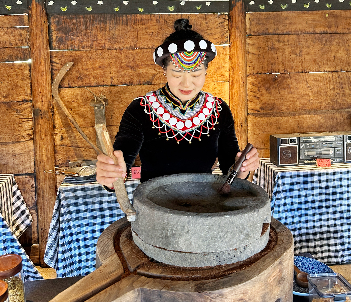 胡玉兰在阳坡店用石磨磨咖啡粉。